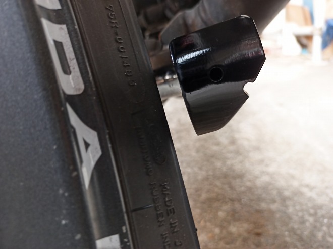 マフラーはもちろん、どこにも干渉なし。跳ね上げ時のリヤタイヤとの間隔もこれだけあれば