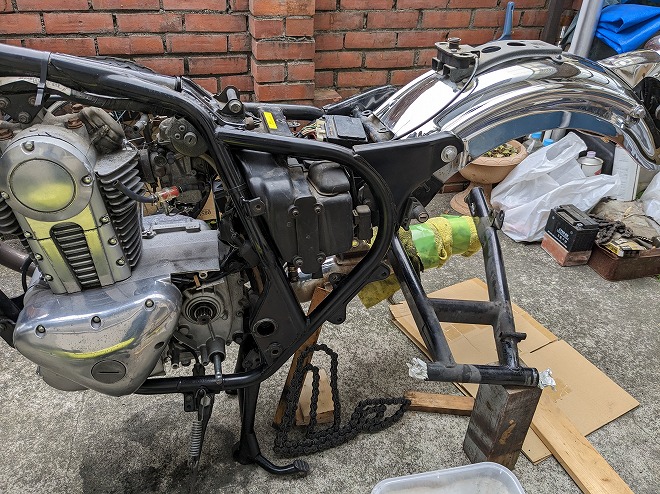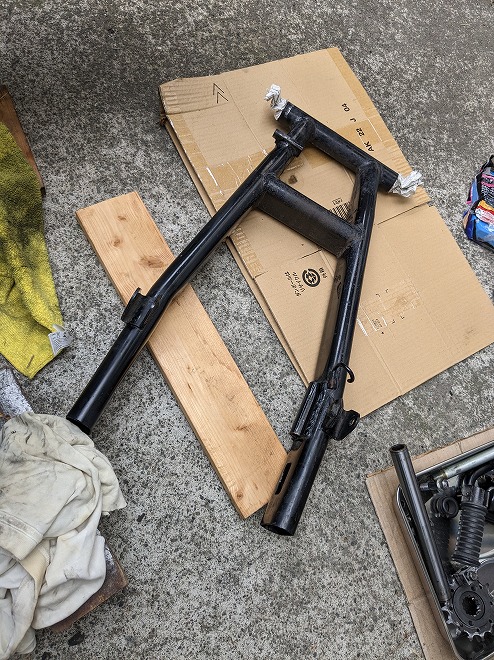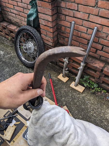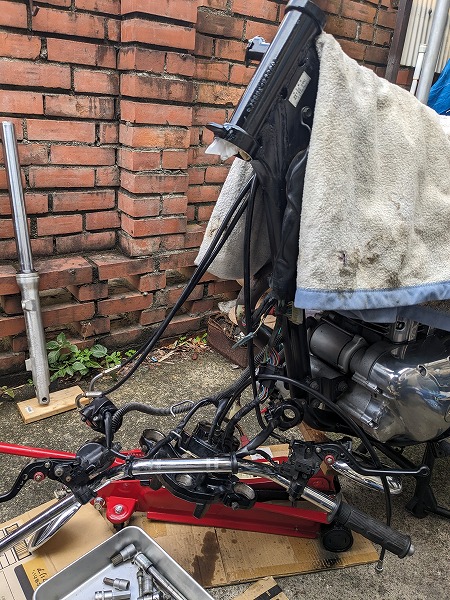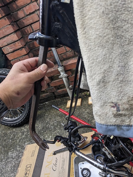 当然ですが、フロントフォークも抜いちまいますので、センタースタンドだけでは