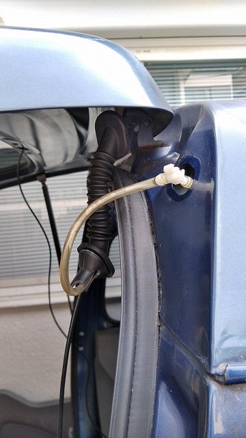 Aピラーのカバーを開けてここにアンテナ配線を通します。