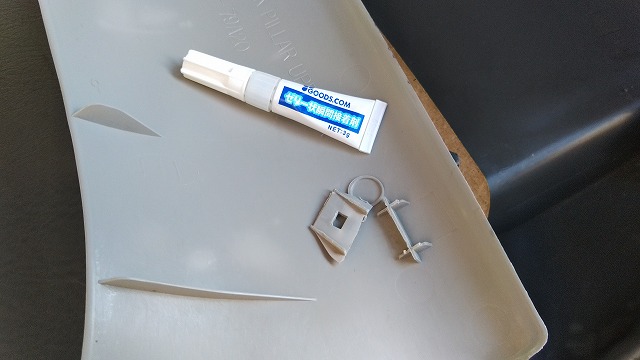 右リアの貨物室トリムの突起が折れてしまっていたので瞬着で頑張ってみました。