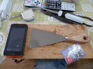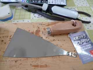 まず、100均で、写真右のようステン製スクレーパーを用意し、