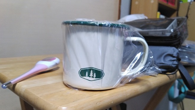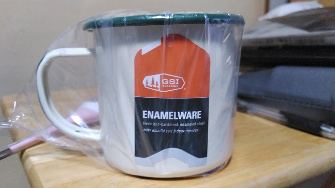 ホーローのマグカップ。ホーローはなかなかいいお値段するのだが、こいつはまぁまぁリーズナブルだった。リーズナブルな奴はあまりデザインがよろしくないのだが、これはまあ許容範囲ってことで。。