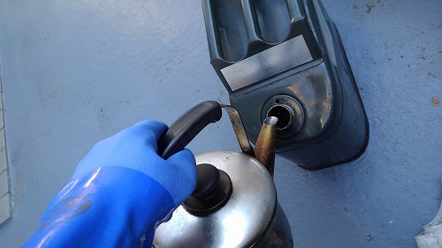 とりあえずカブ用の予備ガソリン缶から500ccを入れてみたが、現時点では漏れは確認できず。