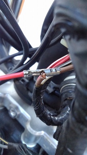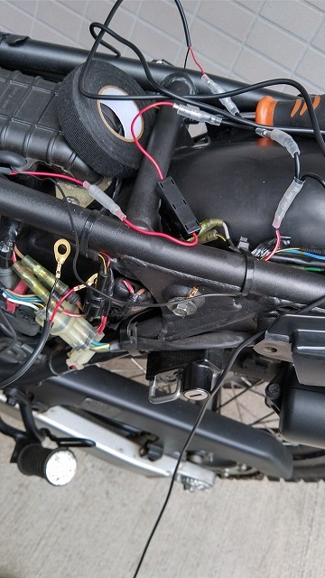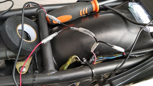 本締め、結線(裏側は、ミラー根元につけるゴムカバーが余ってたのでそれを防水用に利用)