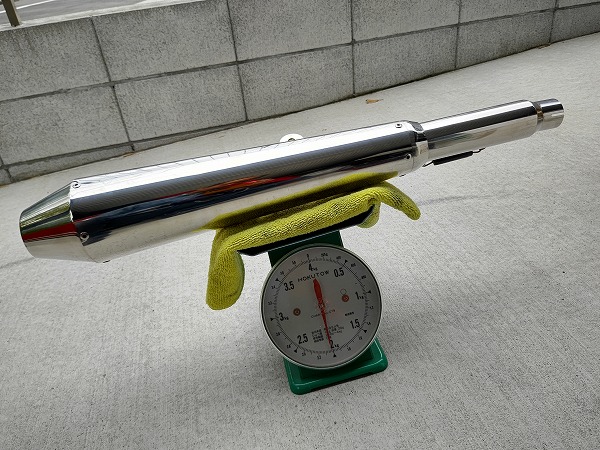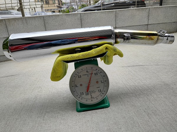 で、気になる重さですが。。。。純正約4.5kg。4kg計りなので、針が振り切ってこれ以上計れません。実際はもう少し重い方に振れる感じでした。もしかしたら5kg近くあるかも。