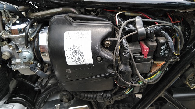 結局、一度締めたサイドカバーを外し、バッテリーカバーも外し、このエアベントホースの