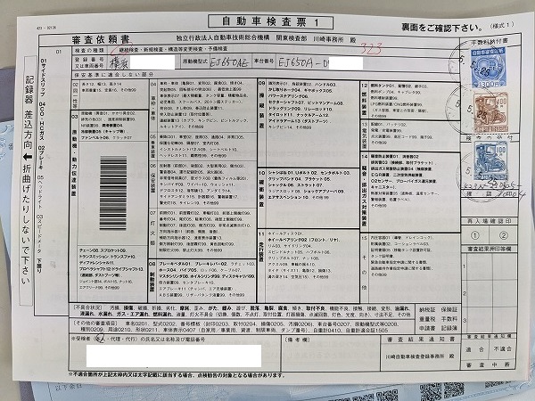 自動車検査票も入手し、必要事項記載、手数料分の印紙(¥1800)を貼り付け。
